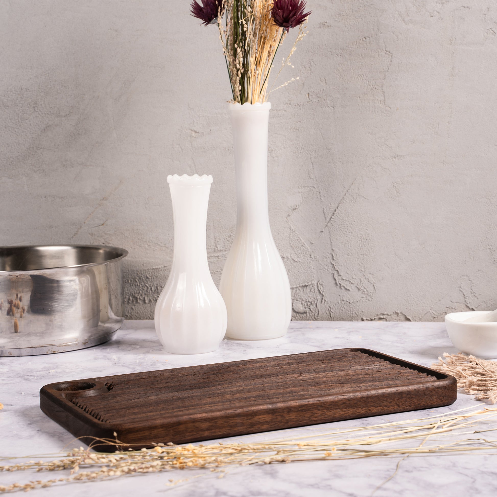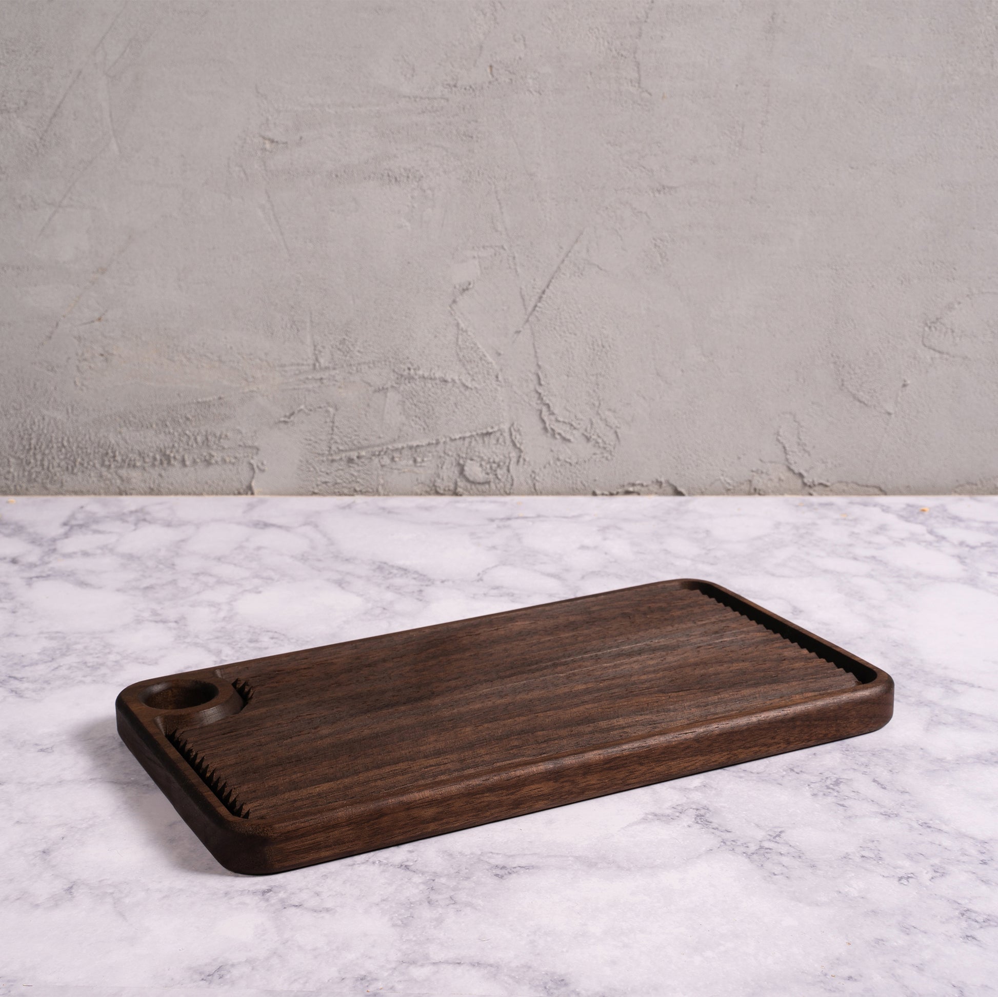 Measuring in at 6 in. x 11 in. x .8 in., this modern styled, multi-functional charcuterie board offers an unimpeded view and texture, of the natural wood used to create them, with the unique ability roll gnocchi and cut any food your heart desires on the reverse's flat cutting surface. Simple, beautiful + durable, what more could you ask for?