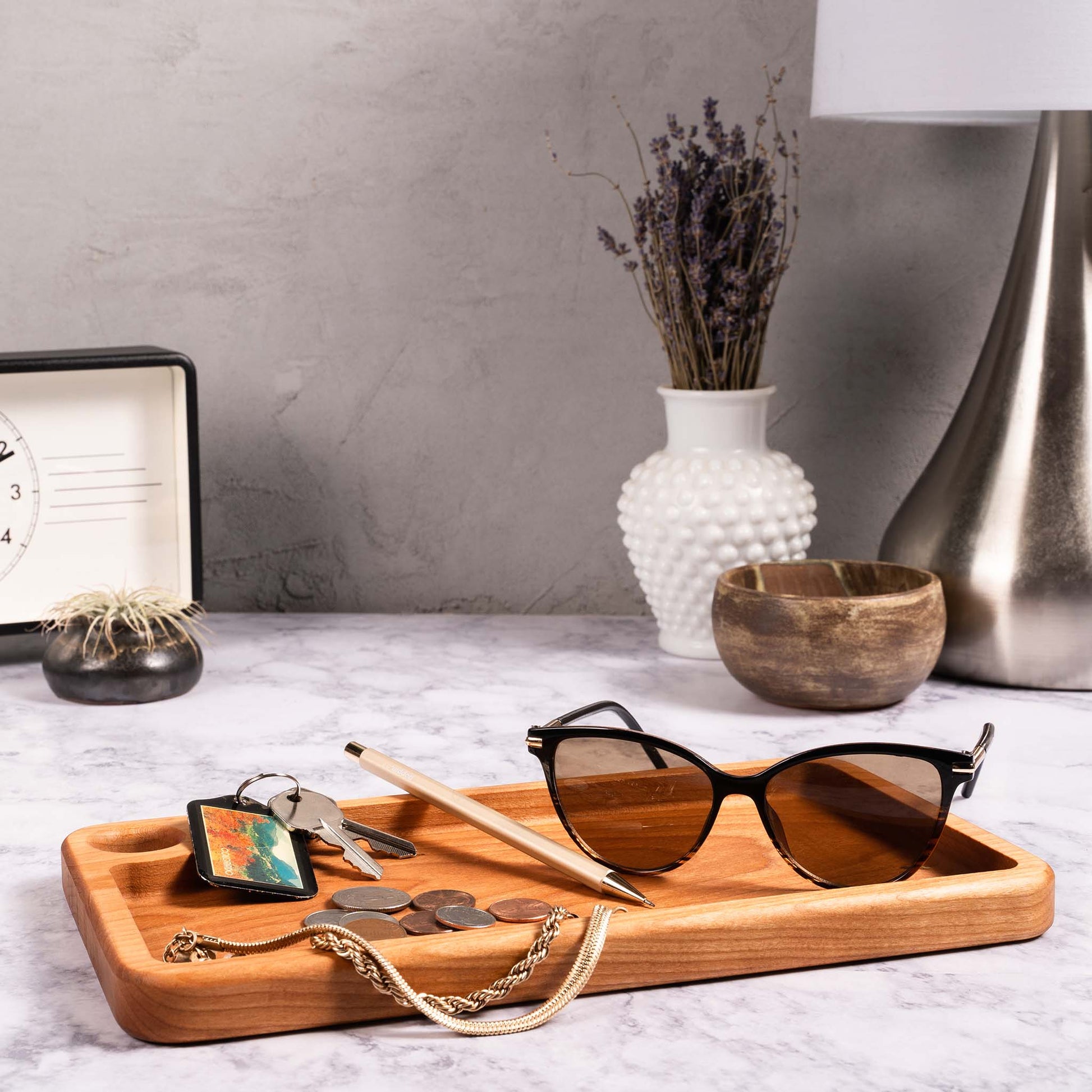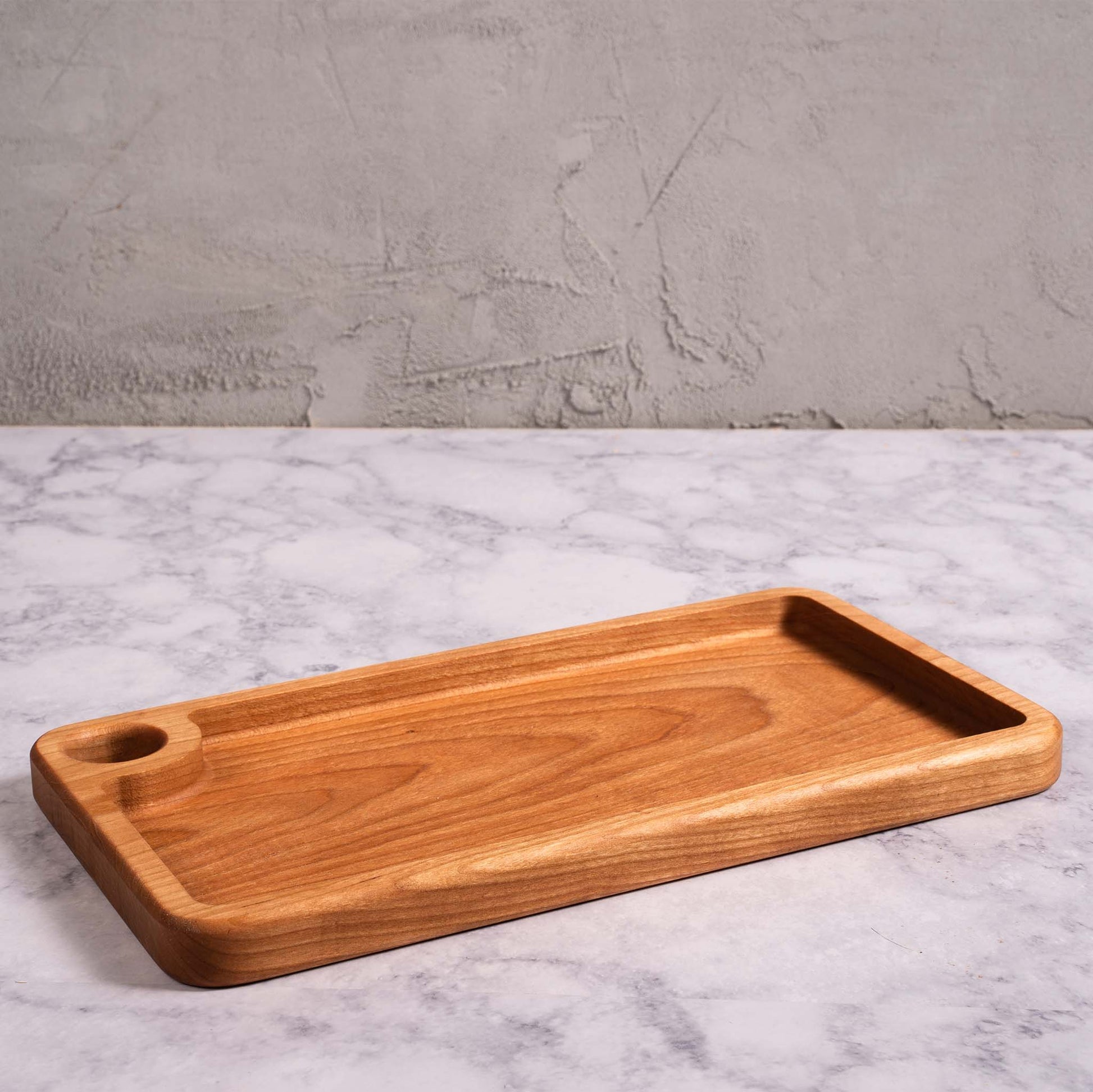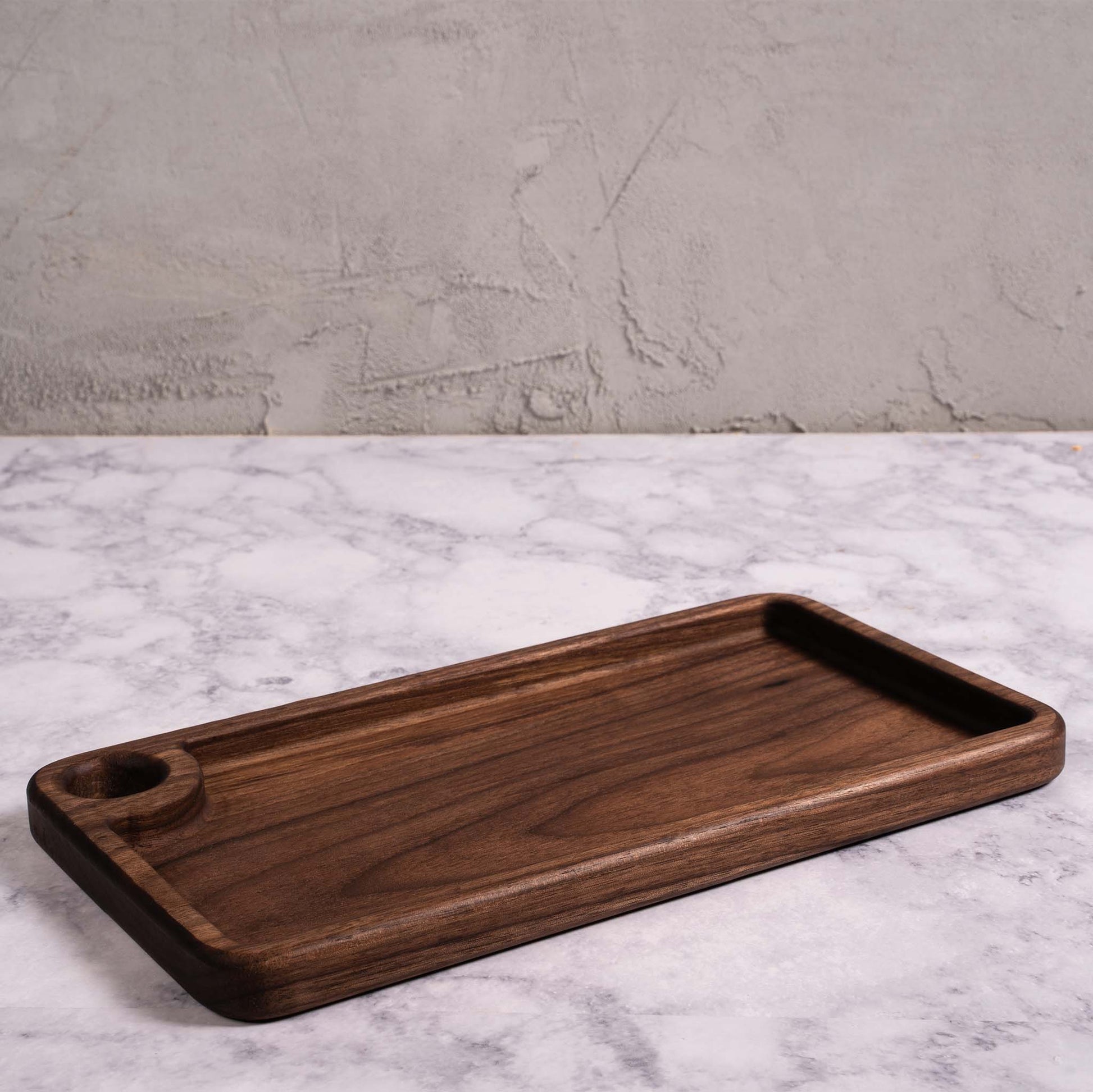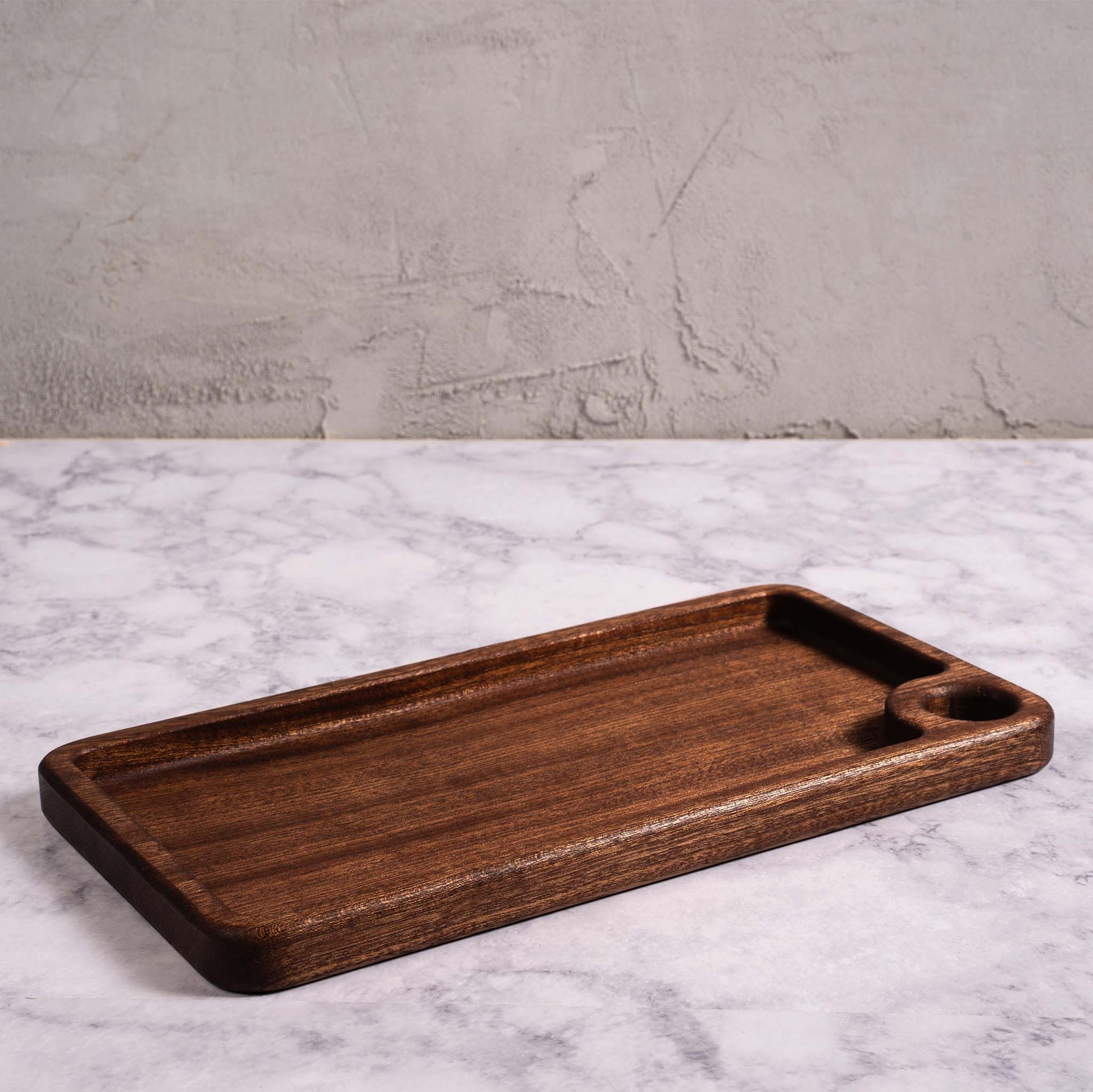 Measuring in at 6 in. x 11 in. x .8 in., this modern styled, multi-functional, large tray offers an unimpeded view and texture, of the natural wood used to create them. You can use this for everyday items such as keys, sunglasses, and change, or having been made with a food safe finish, as much food as you can fit. Simple, beautiful + durable, what more could you ask for?